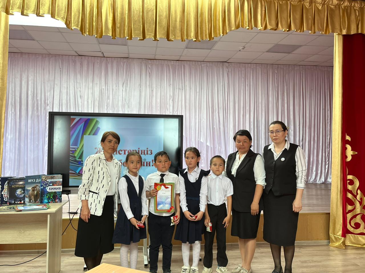 Қажығали Мұханбетқалиұлы атындағы орта мектеп-гимназиясында «Оқуға құштар мектеп» жобасы аясында 23 сәуір - Халықаралық кітап және авторлық құқық күніне орай 2 сыныптар арасында «Кітап – тарих, шежіре» атты топтық сайыс өткізілді. Сайыс барысында 3 топ «Сұраққа жауап», «Сиқырлы әліпби», «Оң қаратып жаз», «Орнын тап», «4 сурет,1 сөз» деген кезеңдер бойынша өз білімдерін көрсетіп, әділқазылар алқасы жеңімпаз топты анықтады. Оқушылар өте белсенді қатысты.